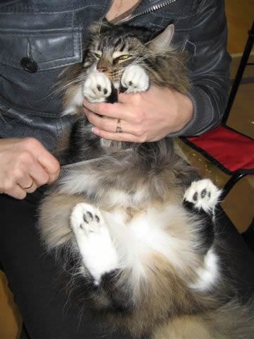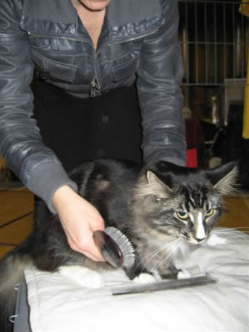 7.- La preparación del gato Como las exposiciones son concursos de belleza, debemos preparar a nuestro gato para que llegue a ella en la mejor condición posible. Debemos bañar a nuestro gato dos o tres días antes de la exposición, usando un champú para gatos adecuado y posterior cepillado y peinado. Haciendo hincapié en las partes blancas del gato, si las tuviere. Algunos machos tienen la particularidad de segregar mucha grasa en la parte superior de la cola, llamada "cola de semental", deberemos lavar varias veces la cola para eliminar toda esta sustancia grasienta con champu adecuado.Ya en la exposición conviene aplicar polvos de talco en la cola y pechera, siempre que no sea en exceso, y pasar una carda o peine. El proceso de belleza para preparacion para la exposicion se llama Grooming. Tambien se debera cortar las uñas cuidadosamente, ya que un gato asustado puede arañarnos a nosotros o al juez durante la competicion, siendo descalificado por mal comportamiento. |