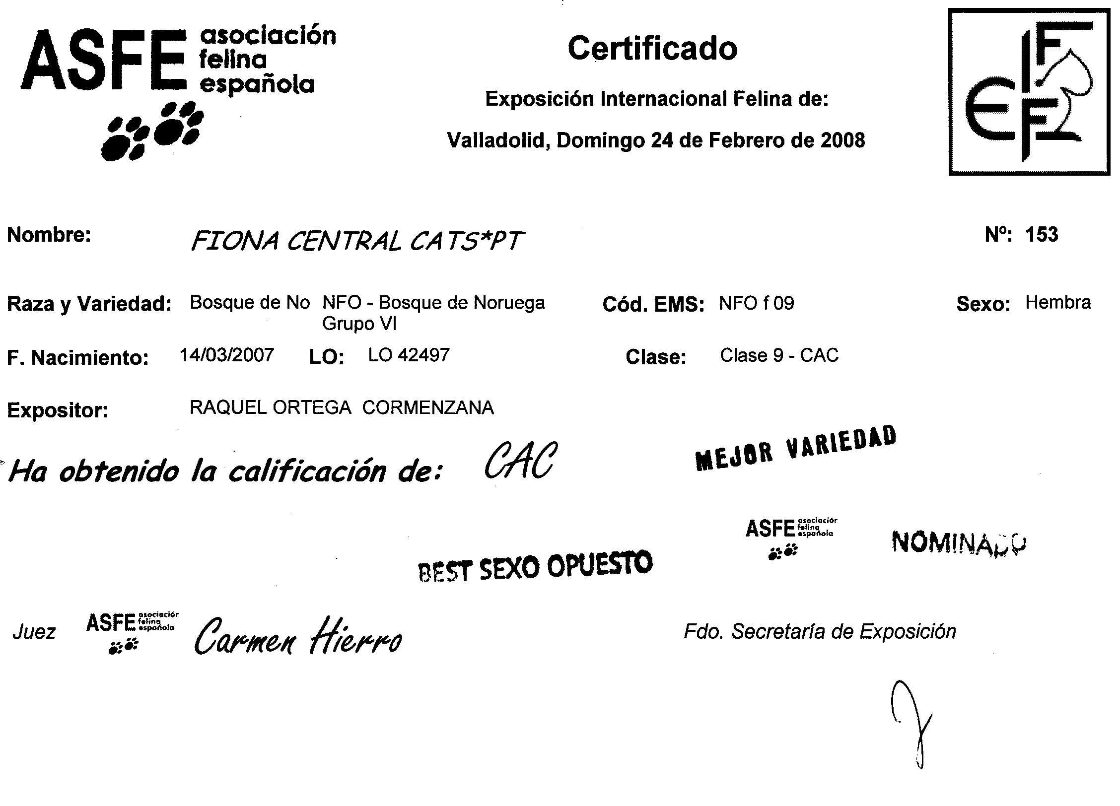 (Asociacion Felina Española) Club Nacional perteneciente a FIFe Federacion Internacional Felina |